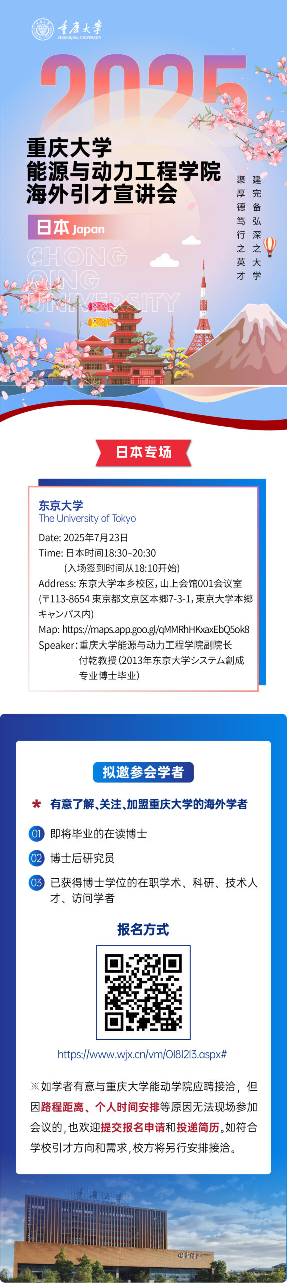 Uncategorized2025重庆大学能源与动力工程学院海外引才宣讲会 16 7 月, 202516 7 月, 2025 - by 事務局 报名方式:扫描以上二维码,填写宣讲会报名表,之后加入以下微信群获取最新消息。 填写报名表并且当日到场的老师学者(前50名)给3000日元路费补助。